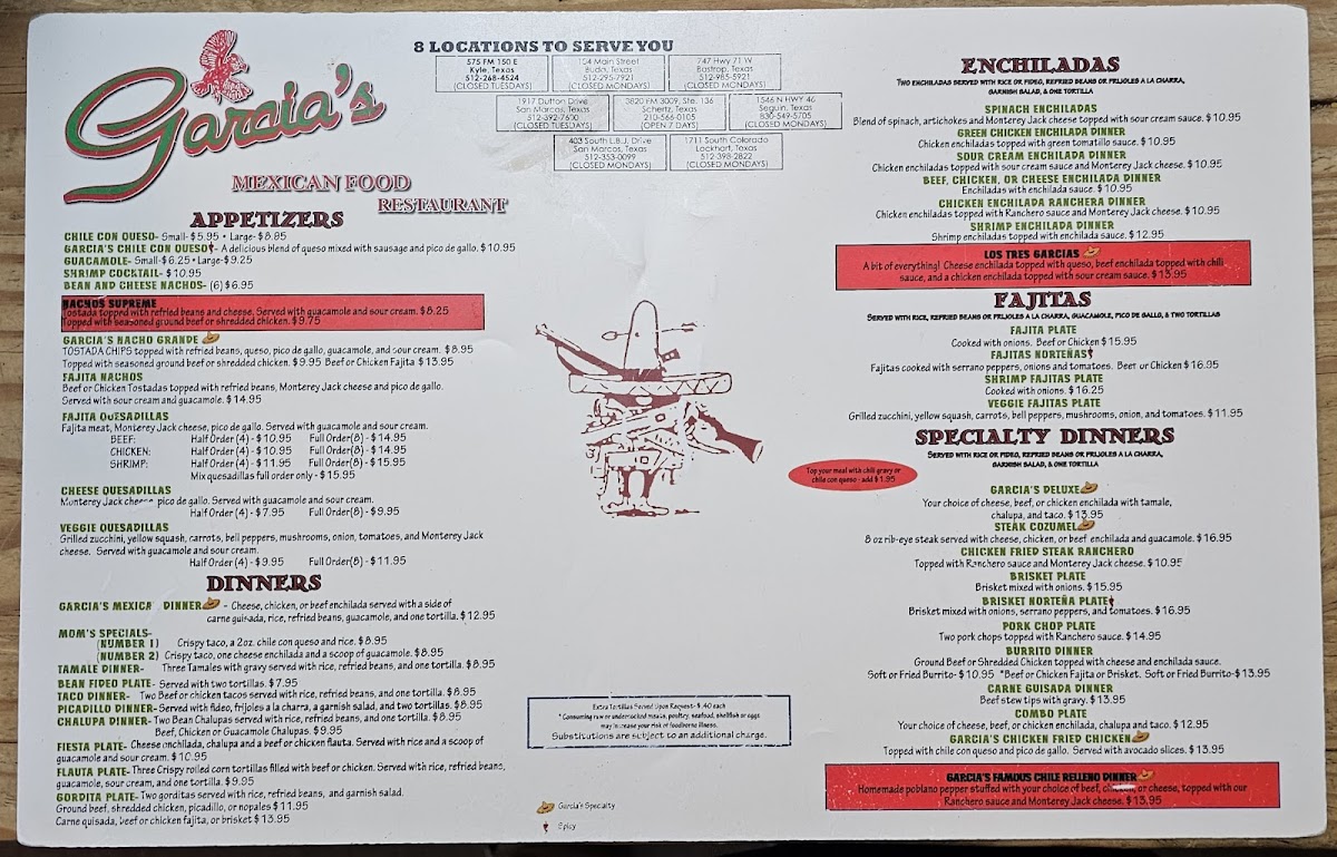 Welcome to Garcia's Mexican Restaurant, a delightful culinary gem located in Kyle, Texas. This vibrant eatery offers an authentic taste of Mexico through its expertly crafted menu. Dive into the Poblano Chicken Enchilada Dinner, where savory chicken enchiladas are generously layered with Garcia's special poblano sauce and Monterey Jack cheese for just $8.50. For something heartier, the Fided Loco Bowl combines fideo, rice, frijoles a la charra, and carne quisada, served alongside a crispy chalupa.