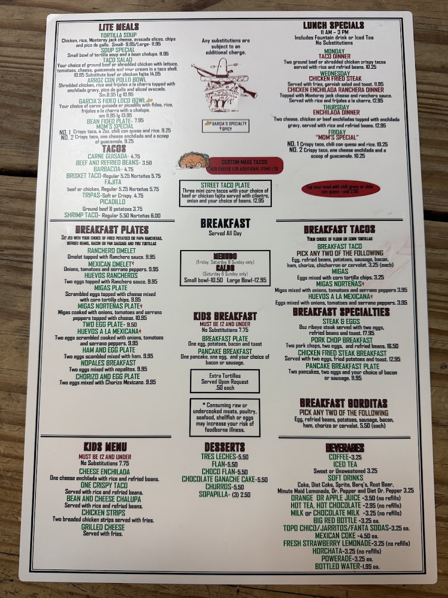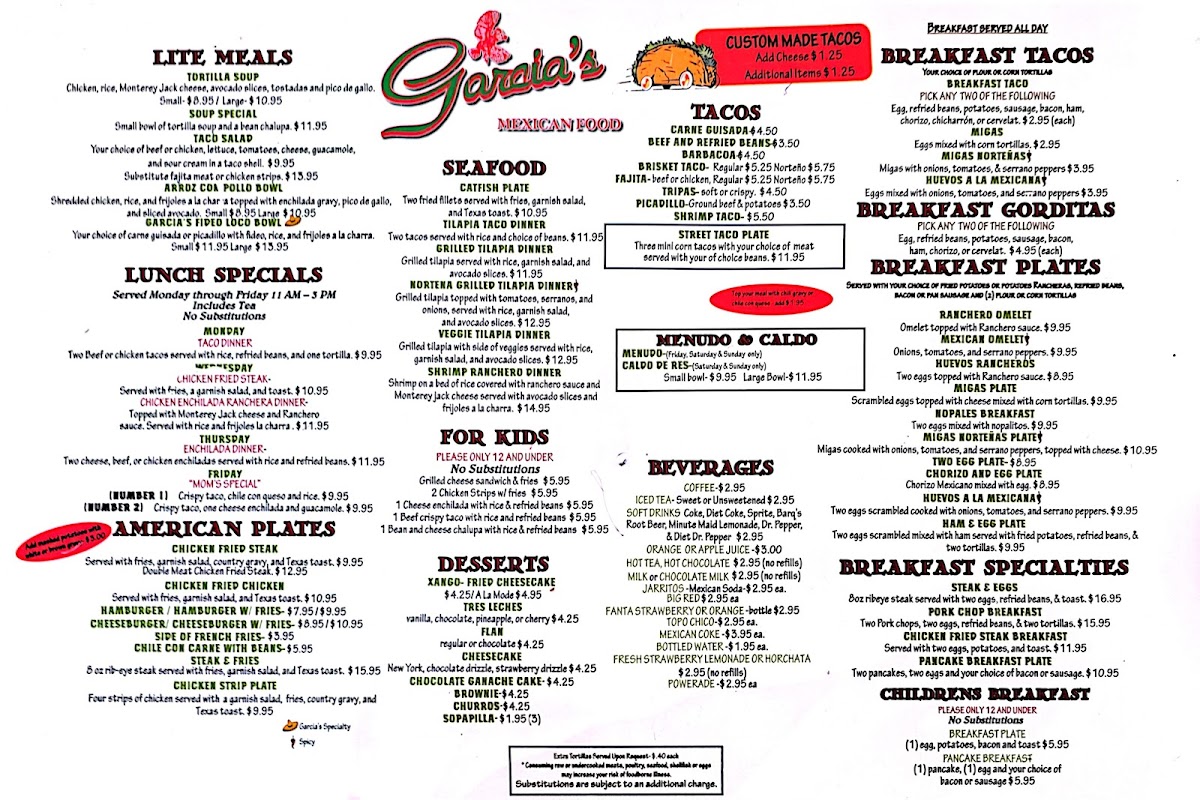 Seafood lovers will adore the Shrimp Ranchero Dinner, featuring shrimp on a bed of rice drizzled with ranchero sauce, complemented by fresh avocado slices. Customers rave about service that matches the food; many have noted the exceptional attention and speed, even during peak times. Whether it's the irresistible menudo or juicy fajitas, Garcia's impresses at every turn, making it a must-visit for Mexican cuisine enthusiasts!